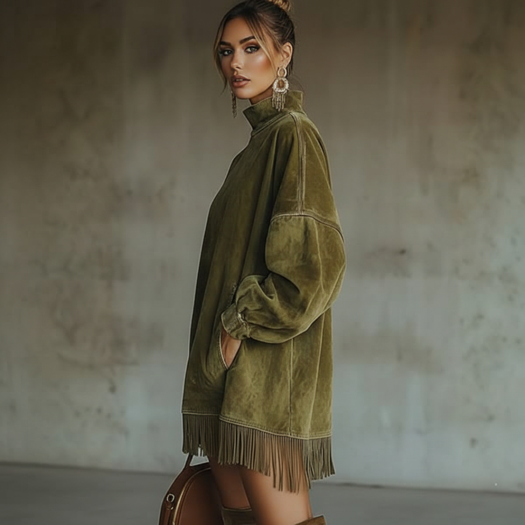 • Design-Details: Hoher Kragen, lange Ärmel, weiches, strukturiertes Material (samtähnlicher/suedeähnlicher Look), fransiger Saum.